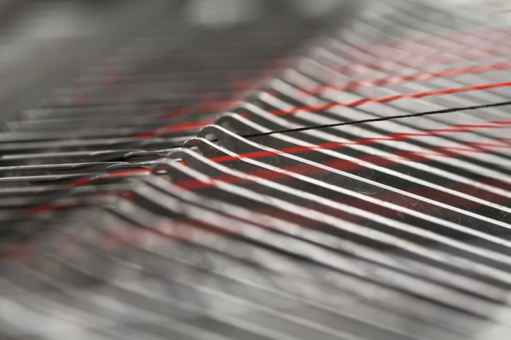 Pracovní šířka: max. 100 cm Dělení stroje: 10E Dvě kladecí lišty pro kladení pod jehlami Dvě kladecí lišty pro kladení frontálního útku Kladecí lišty jsou ovládány mechanicky vačkami anebo řetězem. |
